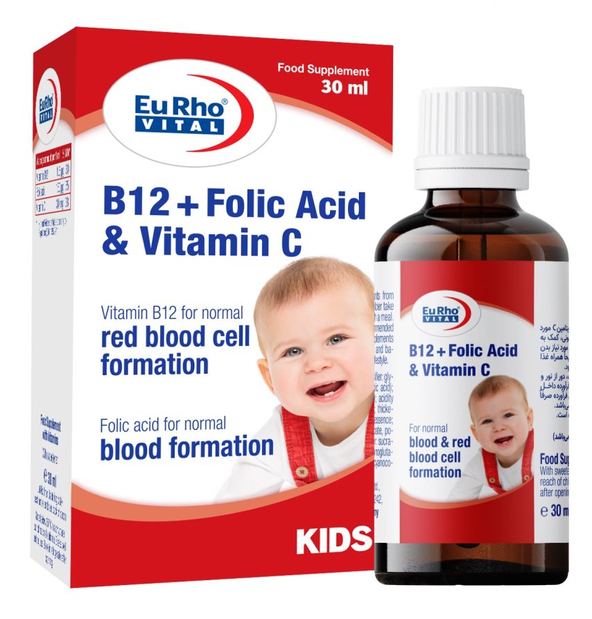 قطره ب12+ فولیک اسید و ویتامین ث یوروویتال محتوی ویتامین B12، فولیک اسید و ویتامین C با طعم پرتقال است و باعث کمک به بهبود رشد جسمی و ذهنی نوزادان و کودکان، تامین انرژی و تکامل شناختی کودکان و همچنین کمک به ساخت گلبول‌های قرمز و رفع کم‌خونی موثر است.