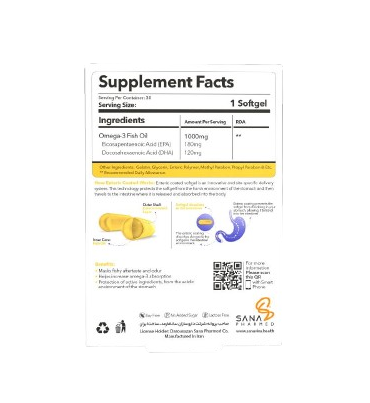 هر عدد کپسول اسمارت امگا محتوی 1000 میلی گرم امگا3 می باشد. اسمارت امگا باعث کاهش تری گلیسیرید، بهبود خونرسانی به سلول های مغزی، قلب، پوست و بینایی می شود.